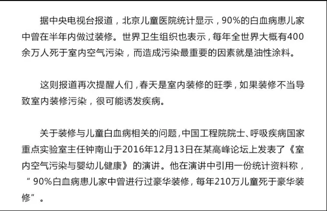 由此看來,媒體報道的90%的兒童白血病患者與家庭裝修有關(guān)至少有一些限定因素,例如,僅限于城市兒童,僅限于一些城市。