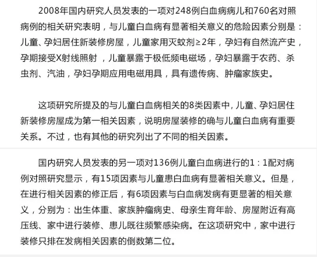 當然,還有其他一些研究結(jié)果也與上述研究結(jié)果大同小異,其中家庭裝修與白血病相關(guān)是一個重要因素,而且大部分研究顯示,即便家庭裝修因素不排在***位,也排在前列。